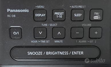 Radiosveglia Panasonic, FM e Dab+. Alimentazione a corrente con funzione di memoria delle stazioni. Possibilità di programmare fino a 2 orari Grazie all'ampio display LCD e al design compatto e intuitivo è la sveglia da comodino ideale Doppio Timer: pratica sveglia con doppio timer Caricabatterie per smartphone: grazie all'uscita USB è possibile ricaricare il proprio smartphone mentre si dorme Tasto per stazioni preferite: la radiosveglia D8 consente di registrare fino a 10 canali radio FM e DAB+ e sintonizzarti con un semplice pulsante