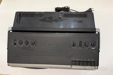 Vendo un rarissimo boombox TV a colori portatile SHARP C-1020GA, anno 1980 made in Japan. Questo eccezionale e raro televisione ha una sezione radio, riproduttore cassetta (da rivedere per l’usura delle cinghie di gomma) e la tv perfettamente funzionante. Ha una leggera botta sul pannello che non compromette il funzionamento. Dimensioni (LxAxP) 450 x 260 x 320 mm, peso netto 12.5 kg.
