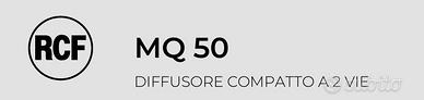 Descrizione Si tratta di una cassa acustica a 2 vie con woofer da 5” e tweeter a cupola caricato su guida d’onda per assicurare intelligibilità e corretta dispersione del suono su un ampio angolo di copertura. Ha supporto integrato che lo rende facile da installare e ne consente il montaggio aderente alla parete limitandone la sporgenza. L’esclusivo sistema di fissaggio ideato per il modello MQ50 permette all’installatore di montare la staffa di fissaggio a muro e di effettuare le connessioni elettriche durante la stessa fase di pre-installazione; successivamente, a fine lavori, l’MQ50 viene posizionato, orientato e collegato senza l’impiego di attrezzi, semplicemente con un “click”. Caratteristiche Codice › › Altoparlante diametro 130 mm (5") in confi gurazione refl ex Tweeter di diametro 19 mm (0,75") a cupola caricato su guida d'onda per assicurare fedeltà e corretta dispersione del suono › › › › Possibilità di pilotare direttamente l'altoparlante interno a 16 O Filtro interno a 12/12 dB/ottava con frequenza di crossover 4,5 kHz Corpo resistente ai raggi UV, con vernice antigraffio, dotato di griglia in acciaio Trasformatore per il collegamento con linee a tensione costante di 100 V, selettore rotativo della potenza › › › Supporto orientabile per montaggio aderente alla parete Per sistemi a tensione costante. Ideale per la diffusione musicale Sistema di collegamento audio Plug&Play per istallazione rapida dopo il fissaggio a muro