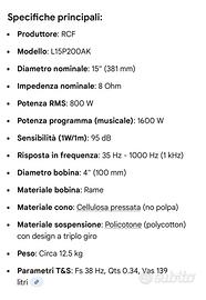 Vendo woofer (Subwoofer) senza cassa RCF che non ha bisogno di presentazioni. Nel corso della sua lunga vita è stato riconato due volte. Potrebbe aver bisogno di un ulteriore intervento di riconatura, anche se due anni fa è stato controllato da una ditta di Concorezzo specializzata in riconature e hanno confermato che non era necessario, quindi in queste condizioni il prezzo è veramente da affare.