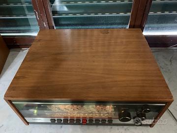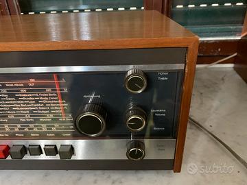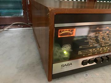 Era il 1967 quando Saba commercializzò questo sinto amplificatore, vero gioiello di quegli anni, più unico che raro. Componenti allo stadio solido futuristico per quell’epoca, a cavallo delle elettroniche a valvole e la nuova tecnologia, dotato di transistor al germanio, poi sostituiti da quelli al silicio, che dovevano emulare il suono delle valvole, ma con una marcia in più. 18 watt per canale su 4 ohm ingressi multipli incluso l’ingresso per giradischi con testina magnetica, 4 gamme d’onda inclusa la FM Stereo e due scale parlanti.Tutto perfettamente funzionante, lampadine comprese. Segnalo la sbeccatura dei due spigoli superiori visibili in foto. Destinato a collezionisti e amanti del vintage.