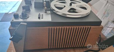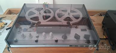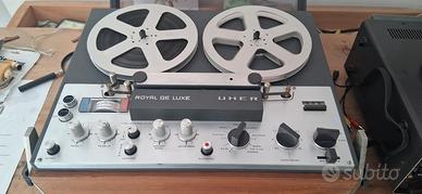 Registratore Uher Royal de Luxe 2 tracce, versione professionale. funzionante in buone condizioni generali. trattandosi di apparecchiuatura vintage viene venduta come vista e piaciuta. preferibile ritiro diretto dopo prove. In caso di spedizione (non consigliabile) la merce viaggia a totale spese e rischio dell'acquirente. Connections • Number of inputs: • Microphone: 0.12 mV to 70 mV, 2 kOhm. • Radio: 1.2 mV to 110 mV, 47 kOhm • Phono (crystal): 40 mV, 1.2 MOhm • Reserve: 200 mV to 18 V, 50 kOhm • Number of outputs: 3 • Monitor: 750 mV, 15 kOhm • Din: 750 mV, 15 kOhm • Amplifier: 6.4 V, 4 Ohm Technical Specifications • Continuous power (via built-in amplifier). • 8 Ohm: • 4 Ohm: 2 x 10 Watt • Dynamic power: • 8 Ohm: • 4 Ohm: • Reel speed: 2.4 / 4.75 / 9.5 / 19 cm/sec • Coil diameter: max. 18 cm • Drive: 1 motor • Tracks: 2 track stereo or 4 track stereo by exchangeable headstock: Z 322 = 2 track, Z 324 = 4 track • Head equipment: erasing head, slide impulse head, recording head, playback head • 2 built-in speakers, can be switched off by plug • Overall frequency response: • 20 ~ 20,000 Hz (19 cm/sec.) 20 ~ 15,000 Hz (9.5 cm/sec.) 30 ~ 10,000 Hz (4.75 cm/sec.) • 50 ~ 5,000 Hz (2.4 cm/sec.) • Treble control capability: • -10 dB (19 cm/sec). • -15 dB (9.5 cm/sec.) • External voltage spacing(full scale): • 56 dB two-track (19 cm/sec.) • 54 dB two-track (9.5 cm/sec.) • 53 dB two-track (4.75 cm/sec.) • Quiet Noise Voltage Ratio (Full Scale) • > 65 dB two-track (19 cm/sec.) • 64 dB two-track (9.5 cm/sec.) • 63 dB two-track (4.75 cm/sec.) • > 60 dB two-track (2.4 cm/sec.) • Synchronisation fluctuations: • 0.05% (19 cm/sec.) • 0.1% (9.5 cm/sec.) • 0.2% (4.75 cm/sec.) • Max. Max. deviation of average speed: +/- 1.5% (At all speeds) • Crosstalk attenuation: 45 dB (1000 Hz, stereo operation) / 60 dB (1000 Hz, opposite stereo operation) • THD: < 3% • Pre-magnetization and erasing frequency: 100 kHz