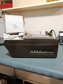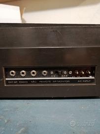 Vendo registratore a bobine portatile SANYO MR-120 per recupero pezzi o riparazione. Dando alimentazione a 9 volt tramite i contatti delle batterie, il registratore si accende, funzionano sia l'amplificatore che il motore ma non è in grado di suonare, in quanto mancano le viti che tengono in posizione i due porta bobina e altri pezzi, tra tra cui un perno guida che tiene teso il nastro mentre passa sulle teststine, il cilindretto che era inserito sul perno capstan sulla quale a sua volta si appoggia il rullo pressore in gomma, il cavo di alimentazione rete e i due coperchi sottostanti che sono quello del vano porta cavo e quello del vano batterie.