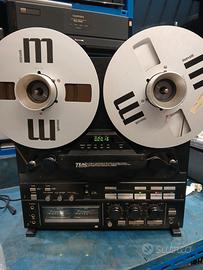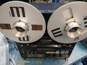 Ottime condizioni qualsiasi prova non spedisco compresa 1 bobina vuota Sistema tracce: 4 tracce, 2 canali stereo; Bobine: Tipo 26 (No. 10), Tipo 17 (No. 7); Testine: registrazione: 2 x Cobalt Amorphous Heads; riproduzione: 2 x Cobalt Amorphous Heads; cancellazione: 2 x Ferrite Heads; Motori: capstan: FG Servo DC Motor x1; bobine: 2 motori DC senza slot; Sistema di trascinamento: doppio capstan ad anello chiuso; Velocità nastro (deviazione): 19 cm/s, 9,5 cm/s (±0,5%); Wow & flutter: 19 cm/s: 0,03% WRMS; 9,5 cm/s: 0,04% WRMS; Tempo avvolgimento iniziale: entro 100 secondi (Bobina tipo 17, 550 m); Risposta in frequenza complessiva: 19 cm/s: 30 Hz – 40 kHz (40 Hz – 33 kHz ±3 dB, -20 VU); 9,5 cm/s: 30 Hz – 24 kHz (40 Hz – 22 kHz ±3 dB, -30 VU); Rapporto segnale/rumore complessivo: 65 dB (WTD, 1 kHz, 3% distorsione armonica) dbx off; 100 dB (WTD, 1 kHz, 3% distorsione armonica) dbx on; Frequenza bias e cancellazione: 150 kHz; Livello di registrazione: 185 nWb/m +6 dB: 0 VU; Gamma dinamica: 115 dB (dbx in, 1 kHz, livello di picco); Tasso di deformazione complessivo: 0,4% (1 kHz, 185 nWb/m); Separazione stereo: 50 dB (1 kHz); Ingressi: microfono: 0,25 mV/-72 dB, impedenza compatibile ≥200 Ω; linea: 60 mV/50 kΩ; Uscite: linea: 0,45 V / impedenza carico ≥10 kΩ; cuffie: fino a 100 mW (8 Ω); Alimentazione: 220 VAC, 50/60 Hz; Consumo: 70 W; Dimensioni esterne: L 432 x A 456 x P 268 mm; Peso: 21 kg.
