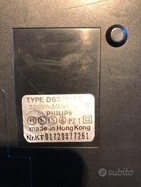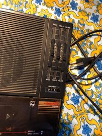 prodotto intorno al 1988 da Philips Hong Kong,•Alimentazione: funziona sia a corrente (220V) che con 6 batterie da 1,5VAltoparlante: dinamico a magnete permanente da 10,5 cmControlli: regolazione volume, toni, indicatore batterie scaricheFunzioni speciali: controllo della velocità di riproduzione utile anche per usi informatici.Dimensioni: 185 x 50 x 280 mm. testato funzionante
