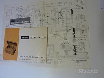 Registratore a nastro stereo a 4 piste GRUNDIG TK 27 con microfoni, libretto istruzioni e schema elettrico. Nota: il supporto motore è rotto (c' è lo schema con le misure per la riparazione). Non spedisco
