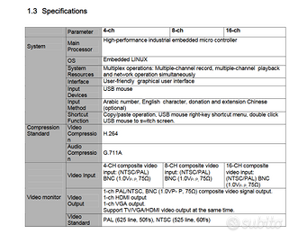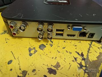 Videoregistratore per telecamere marca "CA l'originale" mod. THV24H264. Fino a 4 canali in ingresso di tipo video composito. Uscita HDMI, VGA o BNC. L'ho comprato usato pochi giorni fa, lo rivendo perché ho scoperto che supporta solo video composito in ingresso, mentre la telecamera che volevo collegarci è HDTVI. Incluso alimentatore e 2 adattatori da BNC maschio a RCA femmina. HDD non incluso.