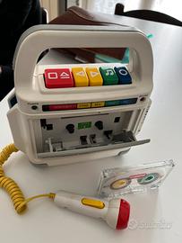 Registratore per bambibi della Playskool con microfono. Inclusa la cassetta originale. Nel comparto batterie una molla è un po’ ossidata. Non sono in grado di confermate il funzionamento. Non si vedono parti rotte o mancanti