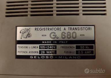 Registatore portatile a nastro G680 primissima serie del 1964 circa, il primo tentativo di realizzazione di un registratore completamente a transistori dalla Magnetofoni Castelli- Geloso, dopo decenni di tecnologia valvolare. Parte anteriore protettiva di plastica grigia. 3 nastri inclusi.