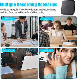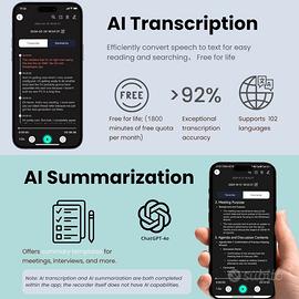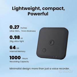 Registratore Vocale AI, Registratori Vocali Digitali Professionale Magnetico da 64GB con ChatGPT 4o per Trascrivere e Riassumere in 102 Lingue,Registratore Vocale per Conferenze (nero) Design portatile con trascrizione AI: con soli 28 g di peso e uno spessore di 7 mm, il registratore vocale digitale è estremamente portatile. Goditi 1800 minuti di servizi di trasposizione voce-testo e riassunto ad alta precisione al mese, supportati da OpenAI Whisper e GPT-4o. Questa tecnologia consente una trascrizione perfetta in 102 lingue e rende più facile per gli utenti creare riepiloghi, registri ed elenchi di cose da fare, aumentando significativamente la produttività quotidiana. Riassunti e traduzioni generati dall'IA: compatibile con ChatGPT-4o: la registratrice vocale AI crea automaticamente riassunti, registrazioni e può tradurre testi. Utilizza più modelli o comandi personalizzati per rendere il lavoro più efficiente, ideale per studenti, giornalisti e team di progetto. Registrazione del telefono: l'anello magnetico integrato consente un facile fissaggio a telefoni e superfici metalliche. L'avanzato sensore di vibrazione consente di posizionare il registratore vocale sul retro del telefono e registrare chiamate telefoniche chiare. Cattura sia la voce dell'altoparlante che la persona che chiama rilevando le vibrazioni attraverso l'auricolare del telefono. Quindi hai una soluzione conveniente ed efficace per registrare conversazioni importanti in qualsiasi momento. Eccellente qualità del suono: questo dispositivo di registrazione è dotato di due microfoni integrati che funzionano con il miglioramento della voce AI per garantire un'eccellente qualità del suono. La collaborazione dei due microfoni migliora la registrazione del suono e riduce i fastidiosi rumori di fondo. Ciò non solo aumenta la chiarezza delle registrazioni, ma conferisce anche al suono una qualità tridimensionale e più completa durante il processo di registrazione. Riduzione del rumore con microfono dual: s