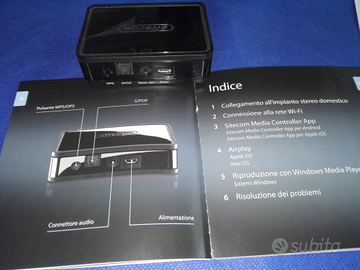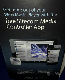 Vendo Player Wi-Fi Sitecom, che permette di ascoltare e riprodurre musica proveniente da qualsiasi dispositivo Wi-Fi (smartphone, tablet, PC, etc.) anche con uno stereo vecchio purché con ingresso RCA (i 2 classici spinotti bianco e rosso); supporta i formati MP2, MP3, MP4, AAC, WMA, WAV, FLAC, OGG, 3GP, con frequenza di campionamento a 48 Hz.