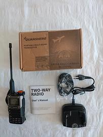 Ricetrasmittente bibanda Quansheng UV K6 con installato ultimo firmware di IJV mod. V-N3.60, ricezione bande HF CB VHF UHF SHF da 15 mHz a 1.2 gHz con possibilità di regolare AGC, BW e sensibilità, modi: AM, FM, WFM, DSB, CW, trasmissione sulle bande VHF e UHF senza limitazioni, 200 memorie programmabili, potenza 5 watt, corredata di: batteria al litio, base di ricarica, antenna bibanda, clip cintura, confezione originale, case in metallo, poco usato e perfettamente funzionante, vendo a 35Euro. Altra radio ricetrasmittente bibanda Quansheng UV K5(8) stesse caratteristiche tecniche della precedente ma con frontale in plastica vendo a Euro 30. Se acquistate insieme: 60Euro