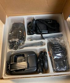 La confezione include 2 radio, 2 antenne, 2 caricabatterie da tavolo, 2 alimentatori, clip da cintura e manuale originale.