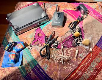 Ricevitore + Bodypack + Archetto + 3 Batterie Tecnologia: Sistema wireless professionale a frequenza VHF. Controlli: Pannello frontale con manopola per la regolazione del volume, indicatore di accensione (POWER), indicatori per le antenne (ANT A/B) e picco audio (AUDIO PEAK). Microfono archetto beige jack 3.5mm vite