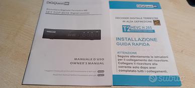 ricevitore digitale terrestre DiGiQuest HD. Questi dispositivi sono progettati per ricevere i canali TV in alta definizione tramite il nuovo standard DVB-T2. Ecco una sintesi delle operazioni principali e dei collegamenti basata sulle istruzioni standard per questo tipo di decoder: Collegamenti Principali Antenna: Collega il cavo dell'antenna terrestre all'ingresso RF IN sul retro del decoder. Televisore: Usa un cavo HDMI per la massima qualità video (1080p). Se hai un vecchio TV, puoi utilizzare la presa SCART. Periferiche Esterne (USB): Come indicato nella pagina aperta del manuale, la porta USB frontale può essere utilizzata per collegare chiavette o hard disk per riprodurre video, musica e foto (funzione Mediaplayer). Completo telecomando,cavo alimentazione,libretto istruzioni