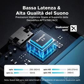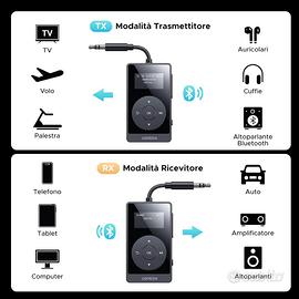 2 in 1 Trasmettitore e ricevitore Bluetooth: in modalità TX trasmette l’audio di qualsiasi dispositivo dotato di uscita AUX e lo invia a cuffie, altoparlanti o altri apparecchi riceventi Bluetooth. In modalità RX riceve l'audio in streaming da smartphone, tablet, laptop e altri dispositivi Bluetooth e lo riproduce su impianti Hi-fi, altoparlanti attivi, sistemi audio domestici, autoradio e in generale apparecchi con ingresso AUX (Jack 3,5 mm.)