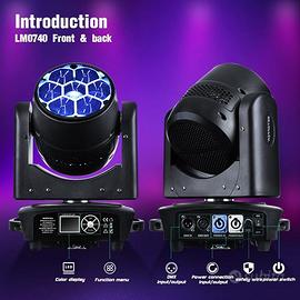 È presente un ampio display LCD che visualizza lo stato di funzionamento delle luci e tutta l’effettistica attivata in un determinato momento. Gli effetti disponibili sono: Strobo, CTO, Wash, Beam, Zoom, Controllo colori RGBW completi, Mulino a vento, caleidoscopio, Piastra dell'obiettivo, Direzione variabile, Rotazione infinita.