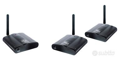 Ripetitore audio/video COBRA 1 Trasmettitore + 2 Ricevitori Frequenza trasmissione 2,4 GHz Portata 50 metri (in campo aperto) 4 canali PLL Antenna integrata Estensore di telecomando Collegamento per presa Scart 3 alimentatori in dotazione