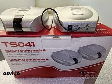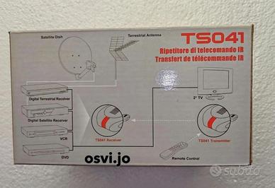 Ripetitore di Telecomando IR Tele System IR TS041: Il Ripetitore di Telecomando IR Tele System TS041 è un ripetitore di telecomando a infrarossi progettato per estendere il raggio d'azione del telecomando originale in altre stanze della casa. È noto per essere uno dei dispositivi di questo tipo più compatti sul mercato. Caratteristiche Principali Funzione: Permette di controllare dispositivi audio/video (come decoder o lettori DVD) situati in una stanza diversa o all'interno di mobili chiusi, ripetendo il segnale IR. Composizione: Il sistema è solitamente composto da una coppia di dispositivi: un ricevitore (che cattura il segnale del telecomando) e un trasmettitore (che invia il segnale al dispositivo da comandare). Design: Presenta dimensioni estremamente ridotte e una finitura di colore argento. La Confezione è composta: N°1 Trasmetitore. N°1 Ricevitore. N°2 Alimentatori. Led Estensore di Infrarossi. Manuale di Istruzioni.