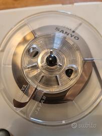 Storia dell'elettronica vintage: un registratore a nastro a bobine rotanti (Reel-to-Reel) portatile prodotto dalla Sanyo tra la fine degli anni '60 e l'inizio anni '70. Modello Serie "IVY Pops", che faceva parte di una linea Sanyo orientata ai giovani dell'epoca, caratterizzata da colori vivaci e un design compatto. Sistema a 2 tracce: Registra e riproduce su nastro magnetico monofonico. Bobine: Supporta bobine piccole, solitamente da 3 pollici (circa 8 cm), protette dal coperchio rimovibile. Apparecchi ancora funzionante, riproduce il nastro ma a volte si ferma in quando è da sostituire la cinghietta di trascinamento (col tempo si é allentata) e non si accende la lucina del power, per il resto si presenta bene, nonostante i suoi anni.