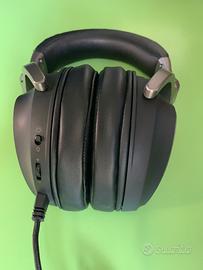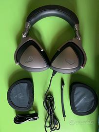 Cuffie ricondizionate marca ROG. Microfono rimovibile, cavo USB-C con prolunga, padiglioni auricolari intercambiabili e luce RGB ai lati. Le cuffie sono regolabili e provviste di un app apposita. Non sono mai state utilizzate, l’unico difetto visibile nell’ultima foto è quello della pelle che si stacca dovuto alla conservazione per un lungo periodo.