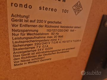 Vendo splendido Rondo Stereo 101 originale anni ’70, dalle informazioni in mio possesso 1970/1971. Impianto stereo dal design minimal e tipico dell’epoca, perfetto per appassionati di vintage, collezionisti o per arredamento retrò.