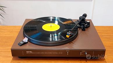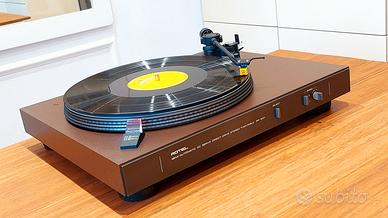 -DISPONIBILE- Infoline Whatsapp: 3319906753 Giradischi Hi-Fi Made in Japan ROTEL RP-1001 anno 1979, in condizioni magnifiche completamente originale, no modifiche EURO 280 Motore servo-controllato a trazione diretta braccio con funzione di ritorno a fine disco testina Audio-Technica AT91 mobile portante interamente in legno stroboscopio + pitch control cover plexiglas esente da crepe dimensioni 440x130x380mm Un giradischi dal look elegante e minimal, bello da vedere grazie alla finitura “bronze” ma anche bello da sentire in virtù della spumeggiante testina Audio-Technica, utilizzata in ogni angolo del globo e spesso rebrandizzata da altri. È montata sull’onnipresente (negli anni 80) braccio giapponese da 9 pollici prodotto da Mitachi, anch’esso campione di vendite come la testina. Una coppia ormai storica che ci racconta belle cose sulla musica. Quando la puntina entra nel microsolco, è tutto il gruppo a vincere: questo perché la postura musicale complessiva si forma attraverso la coppia costante del motore e la sua silenziosità, l’assorbimento delle vibrazioni esterne e la tracciatura corretta del braccio. Più altre variabili minori come cavi, isolamento elettrico etc… Tuttavia, con una meccanica estremamente silenziosa come quella presente, l’RP-1001 farà ricredere l’utente integralista che “il giradischi deve essere a cinghia e manuale”. In conclusione: un Rotel elegante e robusto, che suona bene e si rivaluta nel tempo. Possiamo volere di meglio a queste cifre? L'oggetto sarà consegnato su appuntamento a Vimodrone, dove verrà effettuato un test di funzionamento. La spedizione non è possibile.