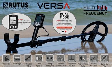 Rutus Versa è il metal detector professionale per tutte le ricerche, terra, spiaggia, acqua di mare e immersione fino a 2,5 metri. E’ leggero, pesa solo 1,3 Kg, pratico con la nuova asta telescopica compatta,
