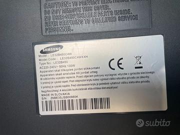 Samsung Modello LE32B450C4W HD Formato Piatto Display LCD 32 pollici Risoluzione 1366 x 768 Pixel Porte/Connettori, HDMI: 3, PC in (D-Sub), Interfaccia comune, Componenti video (YPbPr/YCbCr) in Uscita video composito Uscita audio digitale ottico, Scart, RF, sintonizzatore TV DVB-T Dimensioni Larghezza (con supporto): 797 mm Profondità (con supporto): 252 mm Altezza (con supporto): 576 mm, Peso 11,4 kg. Buone condizioni completo di telecomando