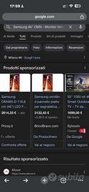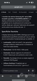 TITOLO: Samsung 46" OMN - Monitor Vetrina 4000 NIT (Milano) DESCRIZIONE: Vendo per realizzo immediato monitor professionale Samsung OMN 46" ad altissima luminosità (4000 nit). Perfetto per vetrine al sole, visibilità totale. Prezzo: €650 + IVA (Fatturabile). Condizioni: Usato, formula Visto e Piaciuto. Prova: Qualsiasi test e visione di persona a Milano. Ritiro: Solo a mano. Il primo che arriva se lo prende. No perditempo, no offerte ridicole.