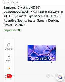 Samsung 55" Crystal UHD U8000F 4K Vision AI Smart TV – Ancora imballato Vendo a 300 Euro – ritiro a Udine no spedizione - No perditempo.