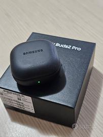 auricolari bluetooth Samsung Galaxy Buds2 Pro con case di ricarica, cavo usb-c e auricolari in silicone intercambiabili.