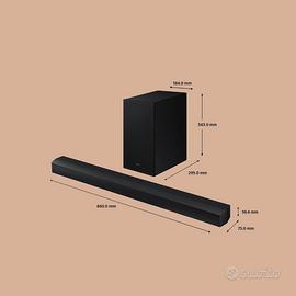 Caratteristiche del sistema Samsung HW-A650/ZF sistema a 3.1 canali con un altoparlante centrale dedicato per migliorare la chiarezza dei dialoghi. Subwoofer wireless attivo con potenza di 250W. Potenza Totale: 430W di potenza massima in uscita. Supporta DTS Virtual X per un suono 3D simulato e Dolby Digital 5.1. Include funzioni come Adaptive Sound Lite (ottimizzazione automatica dell'audio), Game Mode e Bass Boost. Wireless: Il subwoofer si collega alla soundbar tramite Bluetooth/Wireless senza bisogno di cavi audio aggiuntivi. Porte Soundbar: Dispone di HDMI ARC (per il controllo con un unico telecomando TV), ingresso Ottico e porta USB per la riproduzione musicale. Possibilità di spedire con TuttoSubito
