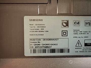Televisore Samsung 43” QLED 4K, perfetto per uso quotidiano, film e streaming. Risoluzione 4K (Ultra HD) Tecnologia QLED (ottima qualità immagine) Smart TV (Netflix, Prime, YouTube, ecc.) Perfettamente funzionante comprensivo di cavo di alimentazione e telecomando originale Condizioni molto buone