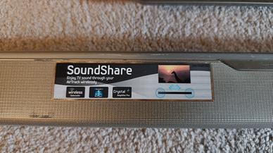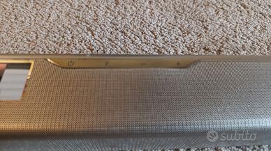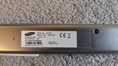 Samsung SOUNDBAR HW-F551 + Wireless&Active Subwoofer PS-WF551 Perfetamente funzionante. Condizioni estetiche molto buone a parte qualche lieve segno di usura. NOTA: solo ritiro di persona - ma per questioni logistiche/personali l'impianto è già imballato e pronto per il ritiro e non è visionabile. A chi sia interessato posso inviare un video in cui si vede (e si sente) funzionare. Dimensioni della soundbar: 94.3 x 5.5 x 6 cm, peso 2.2 kg Dimensioni del subwoofer: 29.1 x 36.9 x 29.1 cm, peso 7.25 kg ATTENZIONE: Soundbar e Subwoofer hanno alimentazioni separate autonome e si collegano tra loro senza cavi, via wireless. Sistema audio: 2.1 canali, potenza in uscita (RMS): 310 W, formato audio integrato: Dolby Digital, DTS. Colore: Argento. Formati audio supportati: AAC, FLAC, MP3, OGG, WAV, WMA. Audio Return Channel (ARC). Connettività: Bluetooth 2.1, HDMI x2, USB 2.0, ingresso audio digitale ottico. Inclusi: telecomando, manuale, Jack 3.5 (maschio-maschio), prolunga USB, cavo HDMI, alimentatore.