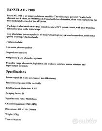 ATTENZIONE: CONTATTI SOLO TRAMITE CHAT DI SUBITO.IT - Offro Amplificatore Integrato Sansui AU 2900 ben funzionante e in condizioni estetiche davvero buonissime considerato che ha oltre 40 anni! I connettori aggiunti per gli altoparlanti che vedete in foto li ho messi io perchè sono molto più pratici per collegare i cavi spellati. Non c'è nulla di rotto. Quelle connessioni a vite che si usavano a quel tempo erano davvero scomodissime. Nessuno però vi vieta di toglierli, ovviamente.