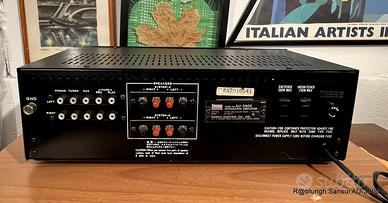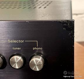 Da dire non c’è molto blasonato esemplare della prestigiosa produzione giapponese in buone condizioni e perfettamente funzionante. In ottime buone condizioni estetiche solo qualche segno sugli spigoli, perfettamente funzionante. Frontale in alluminio nero ad alto spessore serigrafato in bianco e blu con manopole in alluminio con anima in plastica, e levette nere con bordino lucido, tutte le scritte sono perfettamente leggibili, una delle manopole piccole sono in ottimo stato ma quella del livello del microfono NON è originale, quella del volume ha uno brutto segno, lo spigolo in alto a destra era molto tovinato, è stato levigato e poi coperto con vernice gel nera ma comunque si nota’ Il coperchio in acciaio plastificato, il pannello posteriore e il fondo verniciati nero lucido non hanno grandi segni che in parte sono stati ritoccati. All’interno non si notano tracce di riparazioni o manomissioni e nessuna perdita dai condensatori, nessun rumore da potenziometri e commutatori che sono comunque stati disossidati. Caratteristiche: 25W-8 ohm per canale molto ben suonanti (d’altronde chi ha detto che la potenza è sinonimo di qualità?) da 10 a 40.000 hertz con solamente lo 0,15% di distorsione armonica, fattore di smorzamento: 50, rapporto segnale/rumore: 90 dB (linea), separazione dei canali: 60 dB (MM). Ingressi Phono, tuner, aux e tape emicrofono con vegolazione del volume; uscite per due coppie di altoparlanti pilotabili anche contemporaneamente e cuffia e 2 prese di corrente una sotto interruttore (max 100W) e una sempre in tensione (max 150W). Controlli dei toni alti e bassi più filtro passa alto, mono e loudnes Dimensioni Larghezza: 400 mm Altezza 120 mm Profondità 240 millimetri Peso: 7 kg