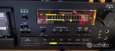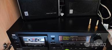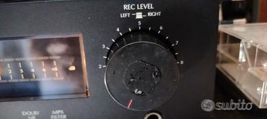 Perfettamente funzionante. Manca lo sportellino mobile e il pomello del volume di registrazione è stato riparato come si vede nelle foto. Il tutto non inficia assolutamente il fulnzionameto che ripeto essere perfetto. Specifications Type: 2-head, single compact cassette deck Track System: 4-track, 2-channel stereo Tape Speed: 4.8 cm/s Heads: 1 x record/playback, 1 x erase Motor: 1 x reel, 1 x capstan Tape Type: type I, CrO2, Metal Noise Reduction: B Frequency Response: 20Hz to 19kHz (Metal tape) Signal to Noise Ratio: 69dB (dolby B) Wow and Flutter: 0.035% Input: 70mV (line), 0.4mV (mic) Output: 0.4V (line) Dimensions: 430 x 128 x 282mm Weight: 5.9kg Finish: black or silver Year: 1981