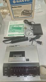 Sanyo MEMO-SCRIBER TRC9100, con manuale, pedale per il controllo a mani libere, microfono e cuffie. Funziona a cassette audio, veniva utilizzato per registrazione e trascrizione vocale