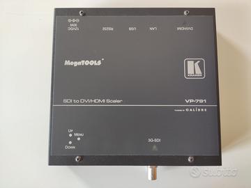 Lo scaler Kramer VP-791 3G-SDI to DVI/HDMI Digital HQV non solo converte video SD, HD, 3G-SDI in DVI e HDMI ma permette anche di fare scaling, image flip, correzione distorsione geometrica e color correction. Accetta tutti i formati in ingresso SDI inclusi 24p e 1080p. Fornisce de-interlaccamento e pull-down se necessario.