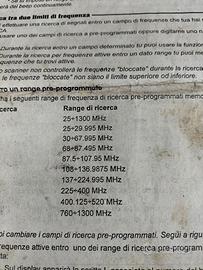 ricevitore panoramico da 25a1300MHz dicasi SCANNER. 1000 canali a ricerca automatica cedo con istruzioni per l uso in italiano dettagliate. Ha la doppia alimentazione 12/220 Ela presa per l antenna esterna. le istruzioni ti insegnano come si usa non una traduzione cinese che ti fa prendere uno scompenso cardiaco.