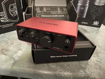 Vendo Focusrite Scarlett Solo (4ª generazione), scheda audio NUOVA, mai usata, perfetta per registrare voce e strumenti in alta qualità.