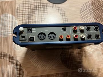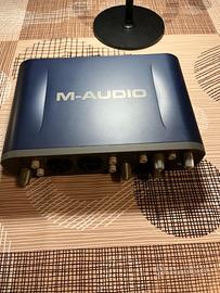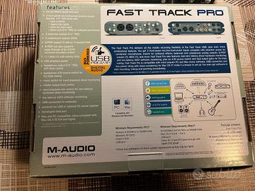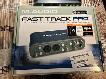 Vendo scheda audio marca M-AUDIO modello Fast Track Pro USB con scatola originale. Adatto per Home Recording, Registrazione in studio, Live Performance Fast Track Pro è un'interfaccia audio USB 2.0 con 4 ingressi e 4 uscite, 2 ingressi mic/line, coppie di uscite doppie, ingresso per processori esterni, monitoraggio hardware con latenza zero, S/PDIF, MIDI , alimentazione via bus USB ed altro ancora. Piena compatibilità con Windows e Macintosh. Caratteristiche principali •Interfaccia audio a 4 ingressi/4 uscite, 24-bit/96 kHz •2 ingressi preamplificati mic/strumento sul pannello frontale (Neutrik XLR/jack TRS da 6,35 mm) ciascuno con: controlli di guadagno, LED segnale/picco, pad per ciascun ingresso, insert a jack (TRS 6,35 mm) per processori esterni •2 uscite bilanciate (TRS 6,35 mm) •4 uscite sbilanciate (RCA) •Ingresso/uscita digitale S/PDIF PCM a 2 canali •l'uscita digitale S/PDIF supporta anche l'invio di audio AC-3/DTS codificato surround •1 ingresso/1 uscita MIDI •Uscita cuffia (jack da 6,35 mm TRS) con controllo del livello •Interruttore sorgente A/B per preascolto in cuffia, stile DJ •Controllo mix ingresso/playback per il monitoraggio diretto via hardware •Controllo di livello uscita master •Monitoraggio diretto hardware a latenza zero •Monitoraggio software ASIO a bassa latenza •Alimentazione via bus USB o alimentatore opzionale •Software in bundle: Pro Tools SE •Kensington Lock Ottime condizioni
