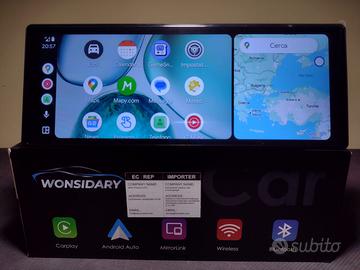 Sistema Infotainment portatile WONSIDARY compatibile con tutti gli autoveicoli - Schermo tattile IPS da 10 Pollici con risoluzione 1600x600 Pixel - Connessione Wireless BLUETOOTH con iPhone e Smartphone Android - Funzione CARPLAY e ANDROID AUTO - Navigazione GPS e assistente vocale integrato - Comandi vocali con SIRI e GOOGLE - Telefonia e messaggistica WhatsApp - Youtube - Spotify - Audio Stereo locale e interfacciamento audio con l'autoradio originale dell'autoveicolo - Riproduzione contenuti multimediali tramite scheda MicroSD - Kit di montaggio completo nella confezione.