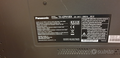Panasonic TH-42PH10EK. SCHERMO al plasma. In omaggio una staffa fissa fatta dal fabbro per posizionare lo schermo al muro inclinato leggermente verso il basso. Preciso che non ha il sintonizzatore tv per cui é necessario collegarci un decoder per vedere la TV. Non dispone di uscite hdmi ne scart. Servono gli adattatori non compresi. Gli attacchi sono visibili dalle foto.