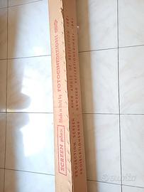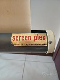 Schermo da proiezione vintage SCREEN PLEX, prodotto in Italia da Fotocinedizioni Bologna. Schermo portatile con treppiede regolabile e telo avvolgibile, ideale per: proiettori vintage, diapositive, cineforum, arredamento retrò / industrial, collezionismo fotografia analogica... Struttura in metallo stabile con apertura semplice e veloce. Presente anche la scatola originale. Il telo presenta normali segni del tempo e leggero ingiallimento nella parte bassa, tipico degli schermi vintage.