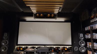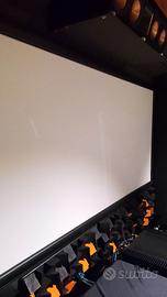 Vendo schermo fisso per videoproiezione con cornice nera in PVC della marca ScreenLine formato panoramico (2:40 - 1). Dimensioni con cornice 283cm X 125cm, dimensioni proiezione (senza cornice) cm 270 X cm 112. Compreso kit per montaggio a parete. Praticamente nuovo, appeso e mai toccato. Vendo per passaggio a schermo ad alto contrasto.