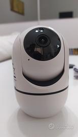 Telecamera di sorveglianza domestica wireless, risoluzione 1080P HD, connessione Wifi 2.4 G, panoramica di 360 gradi, sensore di rilevamento del movimento con allarme, registrazione su micro SD oppure, a scelta, su Cloud, gestibile interamente da smartphone tramite app, comunicazione audio bidirezionale, visione notturna, istruzioni multilingua, tra cui Italiano.