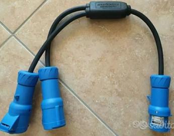 sdoppiatore industriale di corrente CEE 16A. Tipo: Splitter a Y con 1 spina maschio e 2 prese femmine. Capacità: Supporta una corrente massima di 16 Ampere. Utilizzo: Ideale per applicazioni industriali, campeggio, camper o luci da palco. Caratteristiche: Spesso dotato di protezione IP44 per resistenza a spruzzi d'acqua. disponibilità 10 pezzi