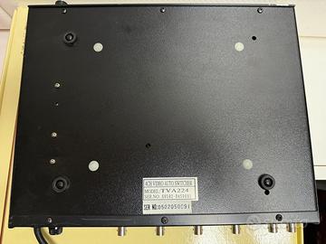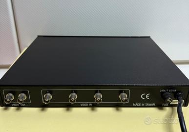 Selettore ciclico a 4 canali Modello: TVA224 Commutatore ciclico automatico e manuale 4 Ingressi video composito BNC 2 Uscite video BNC Selezione delle telecamere tramite selettori posti sul frontale. Ingresso Video: 1,0 Vp-p/75Ohm, 4 ingressi Uscita Video: 1,0 Vp-p/75 Ohm, 2 uscite Guadagno: 0,8 Vp.p fino 1,4 VP-p Banda passante: 20 MHz +/- 3 dB Velocità frequenza: da 1 fino 35 sec Alimentazione: 230 Vac, 60 Hz/50 Hz Assorbimento: 2,25 Watt Connettore video: BNC Dimensioni: 310 x 240 x 45mm